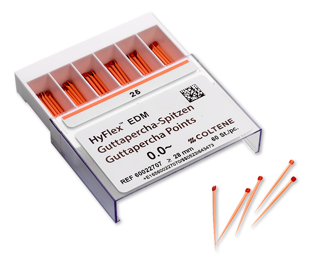 HyFlex EDM Guttaperchaspitzen sind ideal für die Obturation von Wurzelkanälen, die mit HyFlex EDM Feilen aufbereitet wurden. Die Farbcodierung der Guttaperchaspitzen verhindert die Verwechslung verschiedener Größen und minimiert Fehlerquellen. Dadurch wird ein geringerer Materialverlust und eine größere Zeitersparnis erreicht. Die Guttaperchaspitzen sind als Sortiment oder in Einzelgrößen von ≥ 28 mm erhältlich.