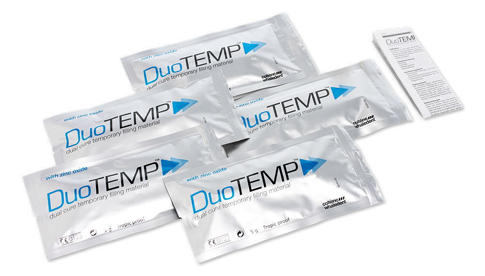 DuoTEMP ist ein dualhärtendes, provisorisches Füllungsmaterial. Es ist ein weisses, eugenolfreies, röntgenopakes, weisses Füllungsmaterial basierend auf Zinkoxid-/Zinksulfat für einen optimalen Schutz. Nach nur 40 s Lichthärtung kann der Patient die Füllung belasten, während die Füllung dank der chemischen Härtung mit Speichel weiter aushärtet.