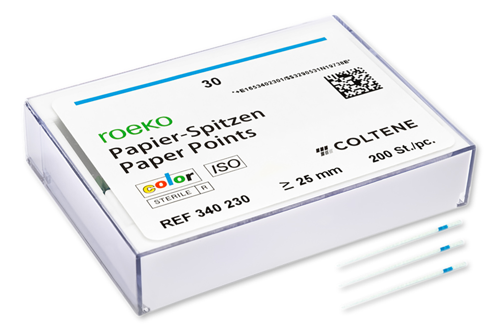 Die Farbcodierung der Papierspitzen verhindert die Verwechslung von verschiedenen Größen. Bei Kontakt mit Körperflüssigkeiten erscheint die Farbe der Papierspitze intensiver – eine optimale Kontrolle auf Restfeuchtigkeit im Kanal. Natriumhypochlorit oder Wasserstoffperoxid bleichen die Spitze dagegen aus und sie wird weiß. Die Papierspitzen sind farbcodiert mit pharmazeutisch und lebensmittelrechtlich zugelassenen Farben und als Sortiment oder in Einzelgrößen von ≥ 25 mm erhältlich.