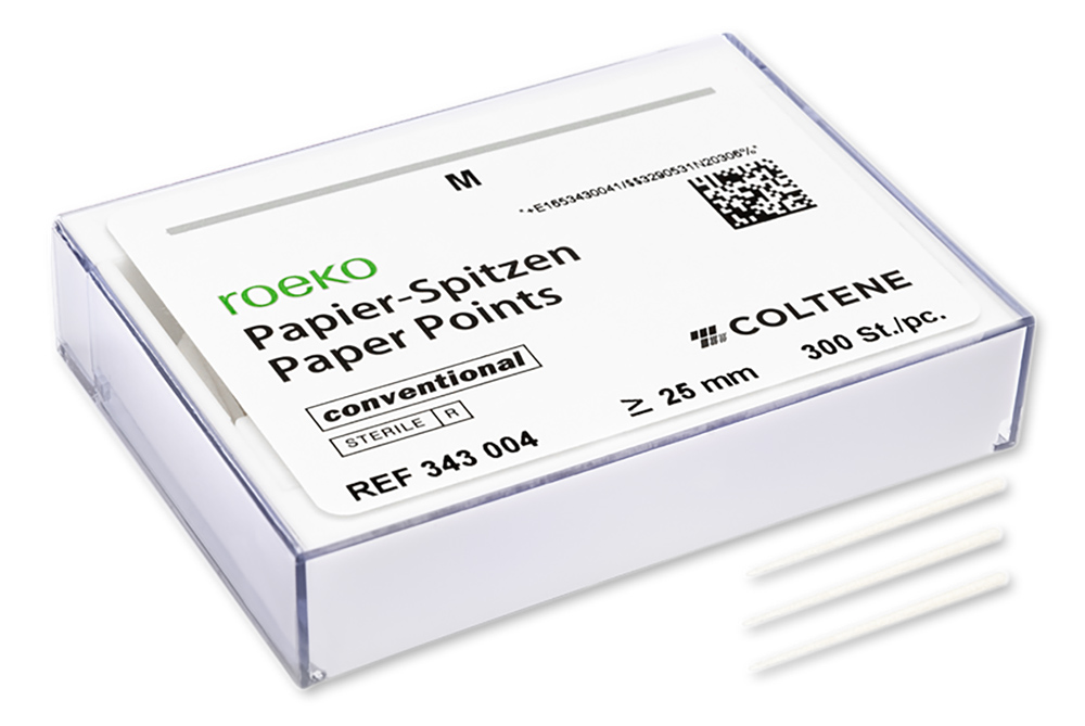 Mit deutlich ausgeprägtem konischem Formverlauf eignen sich ROEKO Papierspitzen Conventional hervorragend zur Trocknung konischerer Wurzelkanäle. Die weißen Spitzen sind stärker konisch geformt als ISO-Spitzen und sind als Sortiment oder in Einzelgrößen von ≥ 25 mm erhältlich.