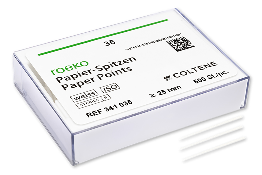 ROEKO weiße Papierspitzen ermöglichen die Kontrolle der Wurzelkanalreinigung und -trocknung. Die Papierspitzen sind als Sortiment oder in Einzelgrößen von ≥ 25 mm erhältlich.