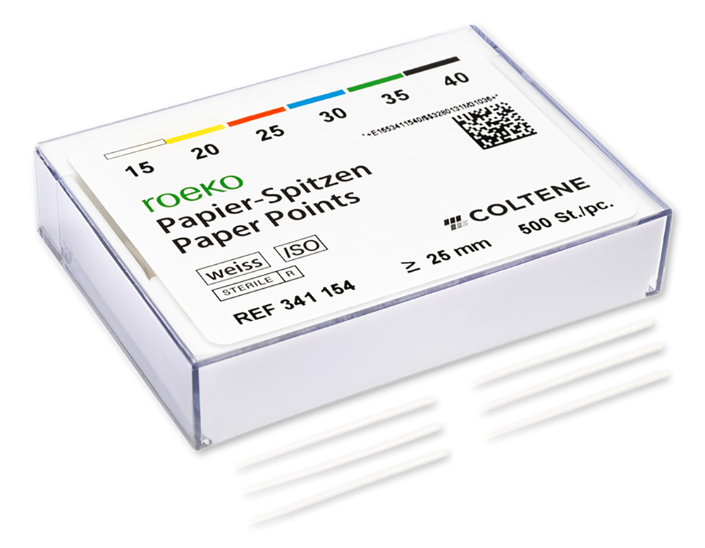 ROEKO weiße Papierspitzen ermöglichen die Kontrolle der Wurzelkanalreinigung und -trocknung. Die Papierspitzen sind als Sortiment oder in Einzelgrößen von ≥ 25 mm erhältlich.
