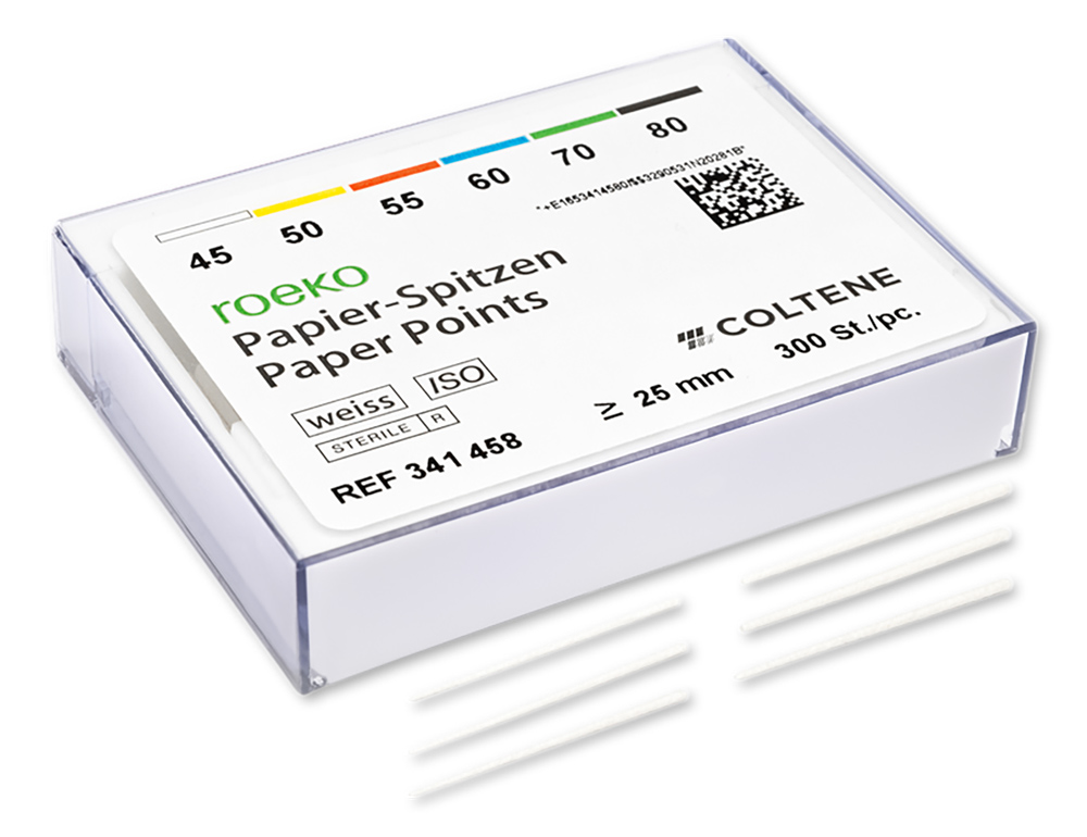 ROEKO weiße Papierspitzen ermöglichen die Kontrolle der Wurzelkanalreinigung und -trocknung. Die Papierspitzen sind als Sortiment oder in Einzelgrößen von ≥ 25 mm erhältlich.