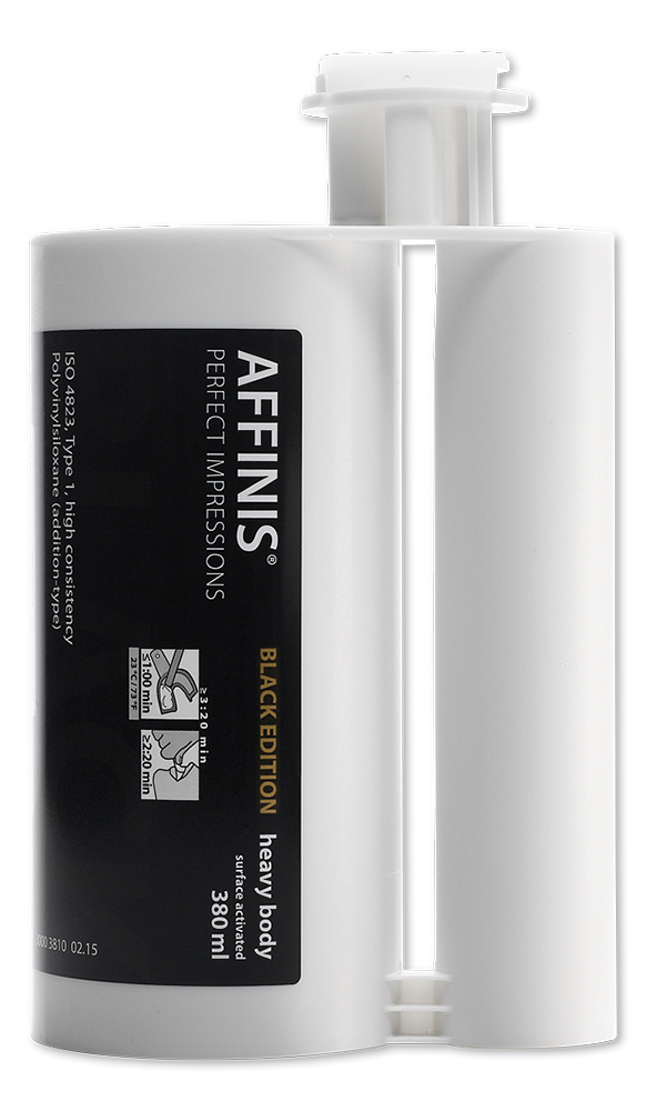 Das schwarze Löffelmaterial AFFINIS heavy body BLACK EDITION erreicht mit dem gold- oder silberfarbenen AFFINIS PRECIOUS eine ausgezeichnete Lesbarkeit der Abformung. Die einzigartige Farbkombination stellt Details noch präziser dar und unterstützt die qualitative Beurteilung des Abformergebnisses. Sichtbare Präzision - mit Liebe zum Detail.