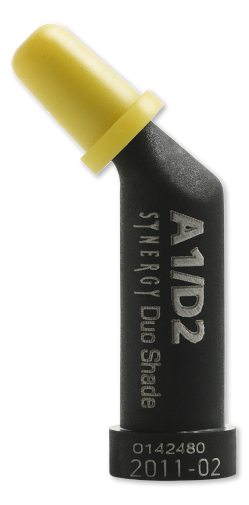 A special feature is the duo-shade system which applies for 6 of the dentin shades. Thanks to the excellent optical self-blending properties one duo shade matches 2 Vita™ shades (e.g. A1/B1 or A2/B2). As a result a small number of shades is sufficient to cover a wide range of tooth shades. In total, the assortment of SYNERGY D6 offers 8 dentin shades and 2 enamel shades.
