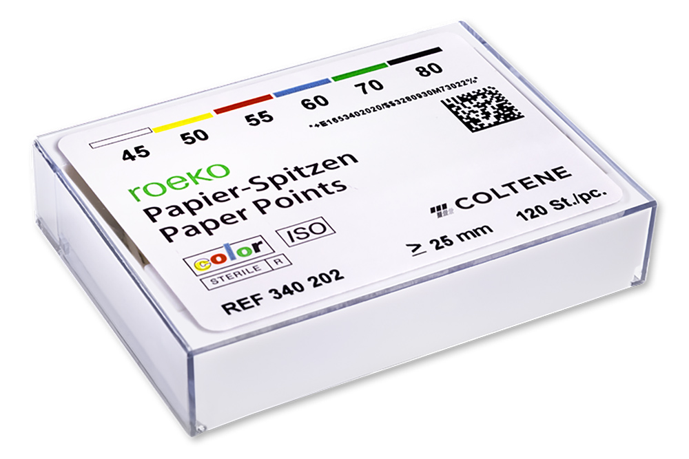 The colour coding of the paper points prevents mixing up sizes. When the points come into contact with body fluids, the colours become deeper, indicating that moisture is still present in the canal. If sodium hypochlorite or hydrogen peroxide are present in the canal, the points will turn white. The paper points are coded with pigments approved for use in pharmaceuticals and food and available assorted or in individual sizes ≥ 25 mm.