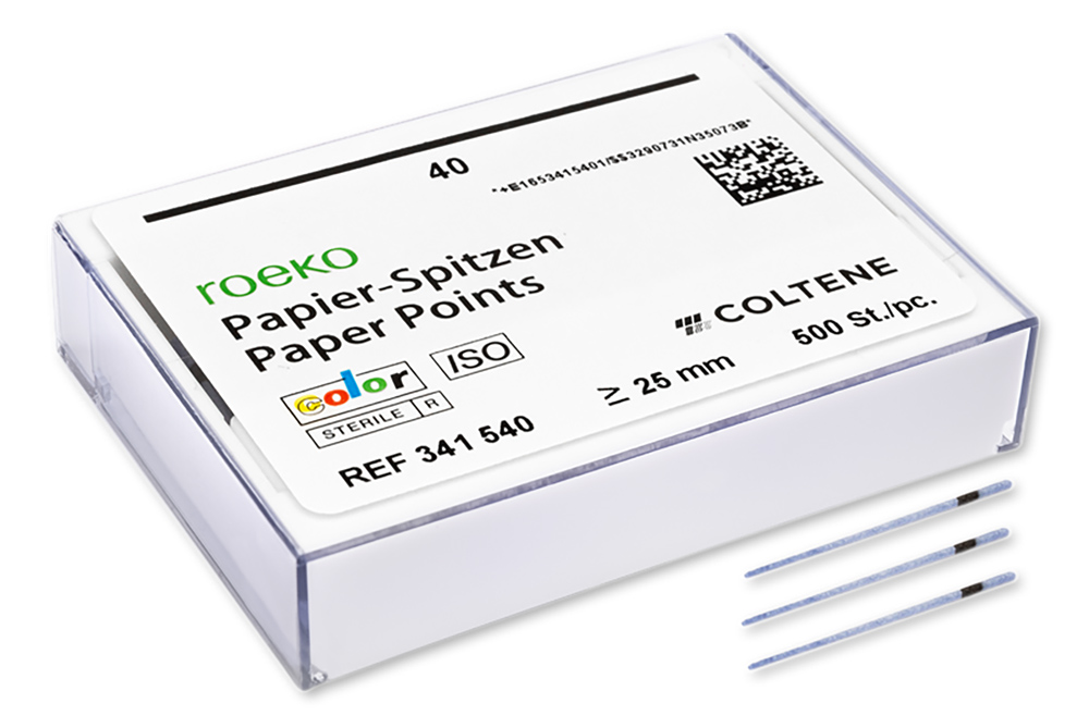 The colour coding of the paper points prevents mixing up sizes. When the points come into contact with body fluids, the colours become deeper, indicating that moisture is still present in the canal. If sodium hypochlorite or hydrogen peroxide are present in the canal, the points will turn white. The paper points are coded with pigments approved for use in pharmaceuticals and food and available assorted or in individual sizes ≥ 25 mm.