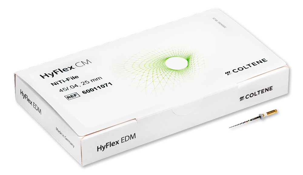 Las limas HyFlex CM están fabricadas de aleación de níquel titanio con el tratamiento térmico Controlled Memory (CM), por eso son extremadamente flexibles y más resistentes a la fatiga clínica. Esto les permite seguir la anatomía del conducto con mucha precisión, reduciendo así el riesgo de que se produzcan escalones, transporte o perforación. Además, las limas se pueden doblar previamente, igual que las limas de acero inoxidable. Esto puede ayudar a evitar la formación de escalones, en especial en los conductos radiculares con una curvatura muy marcada. Esta adaptación de la forma puede revertirse rápidamente con un tratamiento térmico, que devuelve los instrumentos a su forma original. El control visual después del tratamiento térmico permite verificar que la lima puede seguir usándose con seguridad.