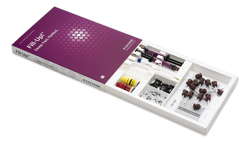Fill-Up! es un material de composite de viscosidad media y de polimerización dual para la obturación múltiple en restauraciones de clase I y II. Debido a su propiedad de curado, los rellenos con Fill-Up! se pueden administrar con una profundidad de relleno arbitraria sin que sea necesario añadir una capa de recubrición adicional.