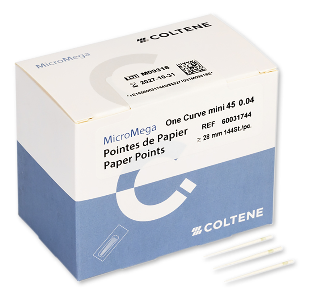 Las puntas de papel MicroMega One Curve Mini son ideales para secar el conducto radicular previamente preparado con las limas MicroMega One Curve mini. En el extremo de la punta, el diámetro coincide con los tamaños ISO, pero la conicidad es la de las limas One Curve mini. Las puntas están disponibles en cajas surtidas o en tamaños individuales ≥28 mm.