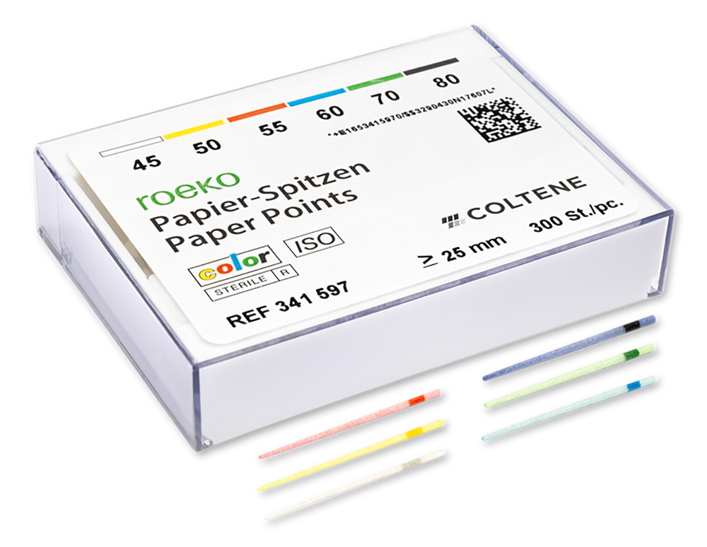 La codificación por colores de las puntas de papel evita que se mezclen los tamaños. Cuando las puntas entran en contacto con los fluidos corporales, los colores se hacen más oscuros, lo que indica que en el conducto sigue habiendo humedad. Si en el conducto hay hipoclorito de sodio o peróxido de hidrógeno, las puntas se volverán blancas. Las puntas de papel están codificadas por colores con pigmentos de uso aprobado en fármacos y alimentos, y están disponibles en cajas surtidas o de tamaños individuales ≥25 mm.