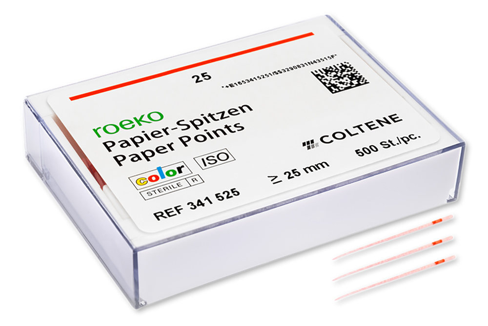La codificación por colores de las puntas de papel evita que se mezclen los tamaños. Cuando las puntas entran en contacto con los fluidos corporales, los colores se hacen más oscuros, lo que indica que en el conducto sigue habiendo humedad. Si en el conducto hay hipoclorito de sodio o peróxido de hidrógeno, las puntas se volverán blancas. Las puntas de papel están codificadas por colores con pigmentos de uso aprobado en fármacos y alimentos, y están disponibles en cajas surtidas o de tamaños individuales ≥25 mm.
