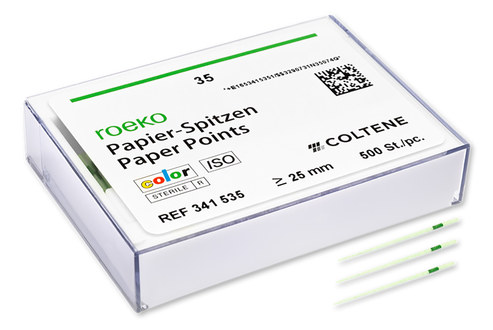 La codificación por colores de las puntas de papel evita que se mezclen los tamaños. Cuando las puntas entran en contacto con los fluidos corporales, los colores se hacen más oscuros, lo que indica que en el conducto sigue habiendo humedad. Si en el conducto hay hipoclorito de sodio o peróxido de hidrógeno, las puntas se volverán blancas. Las puntas de papel están codificadas por colores con pigmentos de uso aprobado en fármacos y alimentos, y están disponibles en cajas surtidas o de tamaños individuales ≥25 mm.