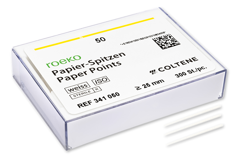 Les pointes de papier blanches ROEKO permettent de contrôler le nettoyage et le séchage du canal radiculaire. Les pointes de papier sont proposées en assortiment ou dans chaque taille ≥ 25 mm.