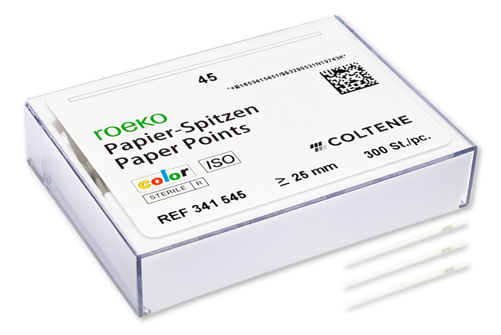 Le code couleur des pointes de papier empêche la confusion des tailles. Lorsque les pointes entrent en contact avec les fluides corporels, les couleurs foncent et indiquent que le canal est encore humide. Les pointes deviennent blanches s’il reste de l’hypochlorite de sodium ou du peroxyde d’hydrogène dans le canal. Les pointes de papier sont colorées avec des pigments à usage pharmaceutique et alimentaire approuvés. Elles sont disponibles en assortiment ou dans chaque taille ≥ 25 mm.