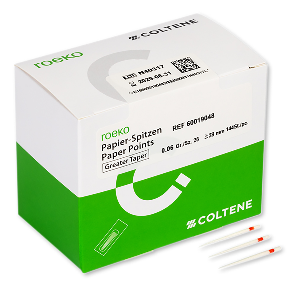 Les pointes de papier à conicité augmentée ROEKO sont parfaites pour le séchage des canaux radiculaires préparés avec les limes HyFlex CM, les limes GT, HERO, ProFile, Quantec, etc. Le diamètre de l’extrémité correspond aux tailles ISO. Le code couleur dans la partie supérieure de la pointe blanche empêche la confusion des tailles. Les pointes de papier sont proposées avec une conicité de 4 ou 6 %, en assortiment ou dans chaque taille ≥ 28 mm.