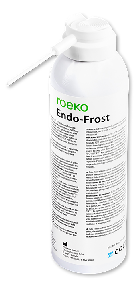 ROEKO Endo-Frost est un spray réfrigérant appliqué avec des boulettes de coton pour vérifier la vitalité de la pulpe. La réponse normale des fibres nerveuses peut être contrôlée en stimulant les terminaisons nerveuses de la pulpe avec le spray réfrigérant. Ce test permet de vérifier la vitalité (présence de sang en circulation) de la dent. Avec une température de -50 °C, le spray Endo-Frost efficace est beaucoup plus froid que la glace ou le chlorure d’éthyle. Le spray de diagnostic est exempt de chlorofluorocarbure et inodore.