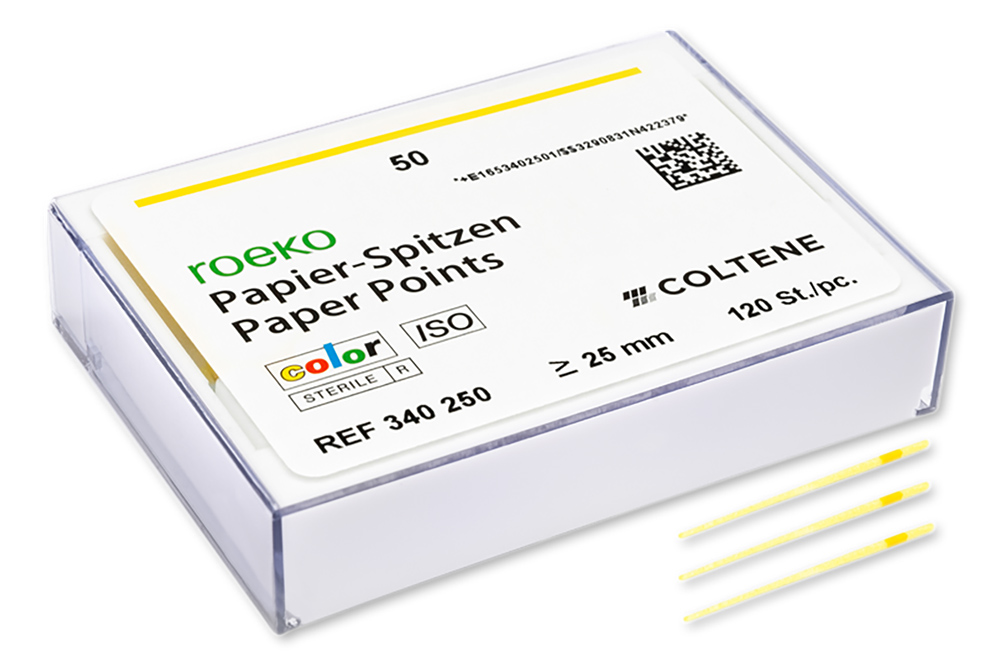 Le code couleur des pointes de papier empêche la confusion des tailles. Lorsque les pointes entrent en contact avec les fluides corporels, les couleurs foncent et indiquent que le canal est encore humide. Les pointes deviennent blanches s’il reste de l’hypochlorite de sodium ou du peroxyde d’hydrogène dans le canal. Les pointes de papier sont colorées avec des pigments à usage pharmaceutique et alimentaire approuvés. Elles sont disponibles en assortiment ou dans chaque taille ≥ 25 mm.