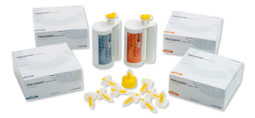 La gamma dei materiali per portaimpronta del nuovo PRESIDENT contiene, oltre ai materiali consueti, due nuove consistenze: MonoBody e putty super soft. Con l'aggiunta del nuovo materiale monofase Monobody, le impronte in implantologia sono ancora più precise, mentre il nuovo putty super soft è particolarmente liscio e facile da miscelare.