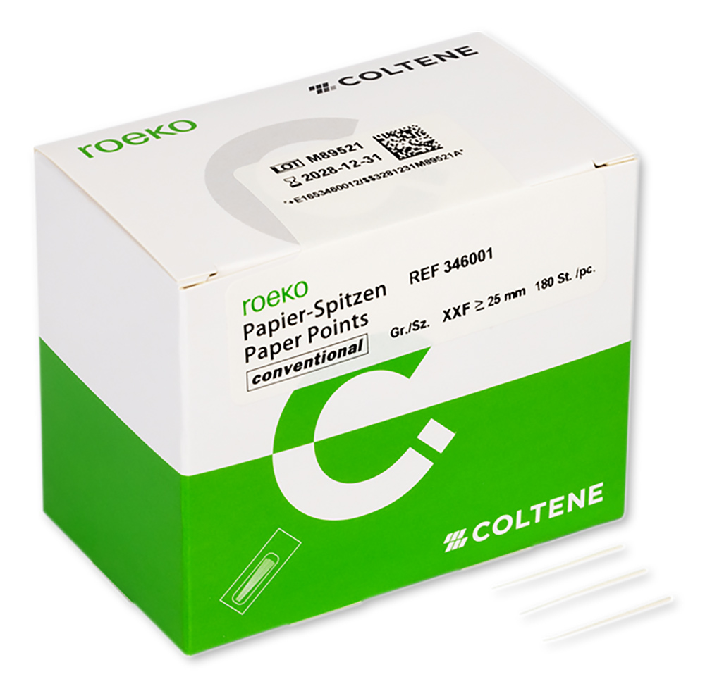 The tapered shape of ROEKO paper points conventional means they are ideal for drying more conical root canals. The white points are more tapered than ISO points and available assorted or in individual sizes ≥ 25 mm.
