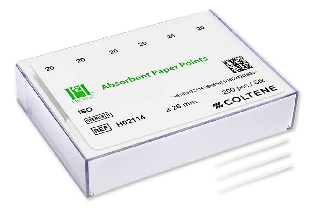 HYGENIC white paper points allow cleaning and drying of the root canal to be monitored. The paper points are available assorted or in individual sizes ≥ 25 mm.