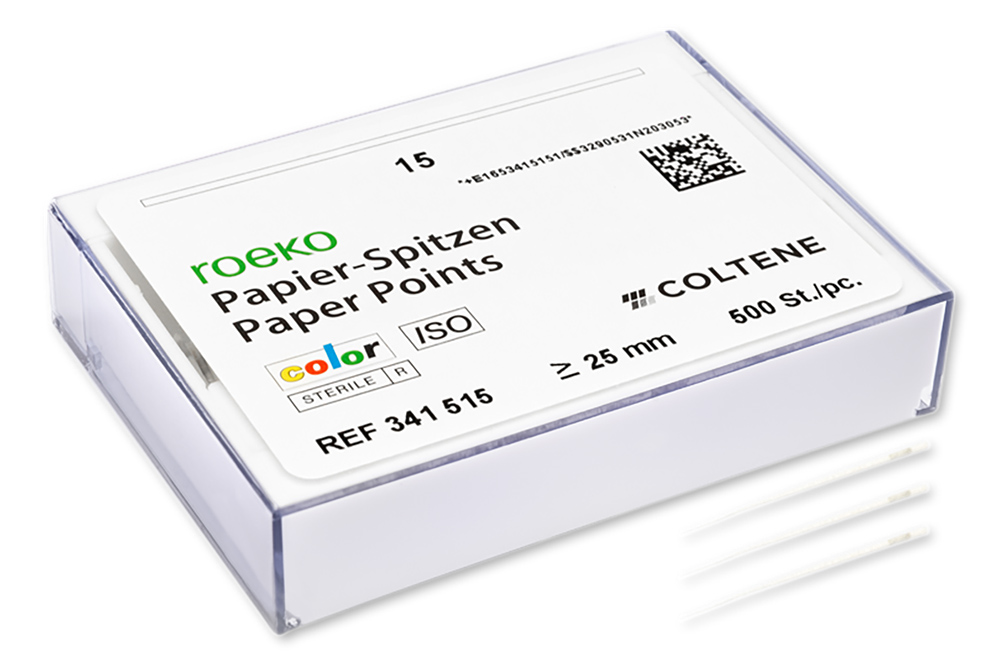The colour coding of the paper points prevents mixing up sizes. When the points come into contact with body fluids, the colours become deeper, indicating that moisture is still present in the canal. If sodium hypochlorite or hydrogen peroxide are present in the canal, the points will turn white. The paper points are coded with pigments approved for use in pharmaceuticals and food and available assorted or in individual sizes ≥ 25 mm.
