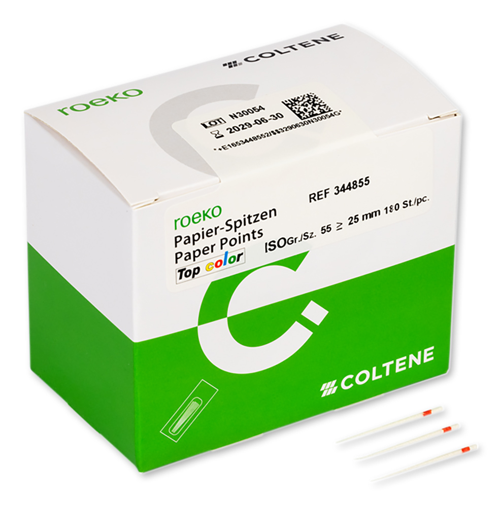 ROEKO top colour paper points combine the advantages of the white and the colour points. The colour coding on top of the points prevents mixing up sizes. The white tip allows cleaning and drying of the root canal to be monitored. The paper points are available assorted or in individual sizes ≥ 25 mm.