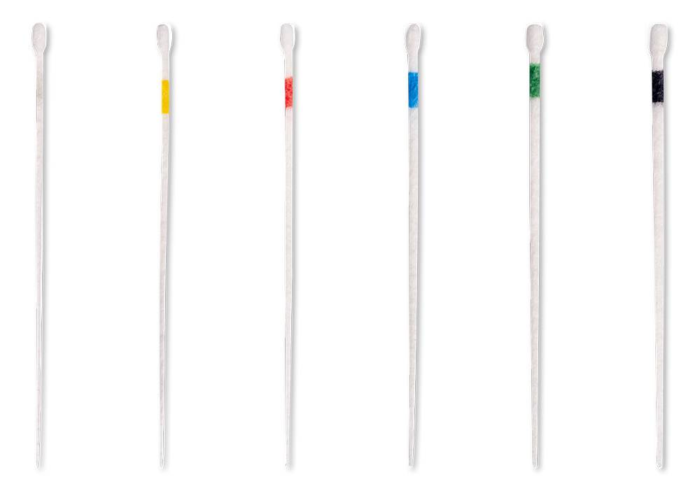 ROEKO top colour paper points combine the advantages of the white and the colour points. The colour coding on top of the points prevents mixing up sizes. The white tip allows cleaning and drying of the root canal to be monitored. The paper points are available assorted or in individual sizes ≥ 25 mm.