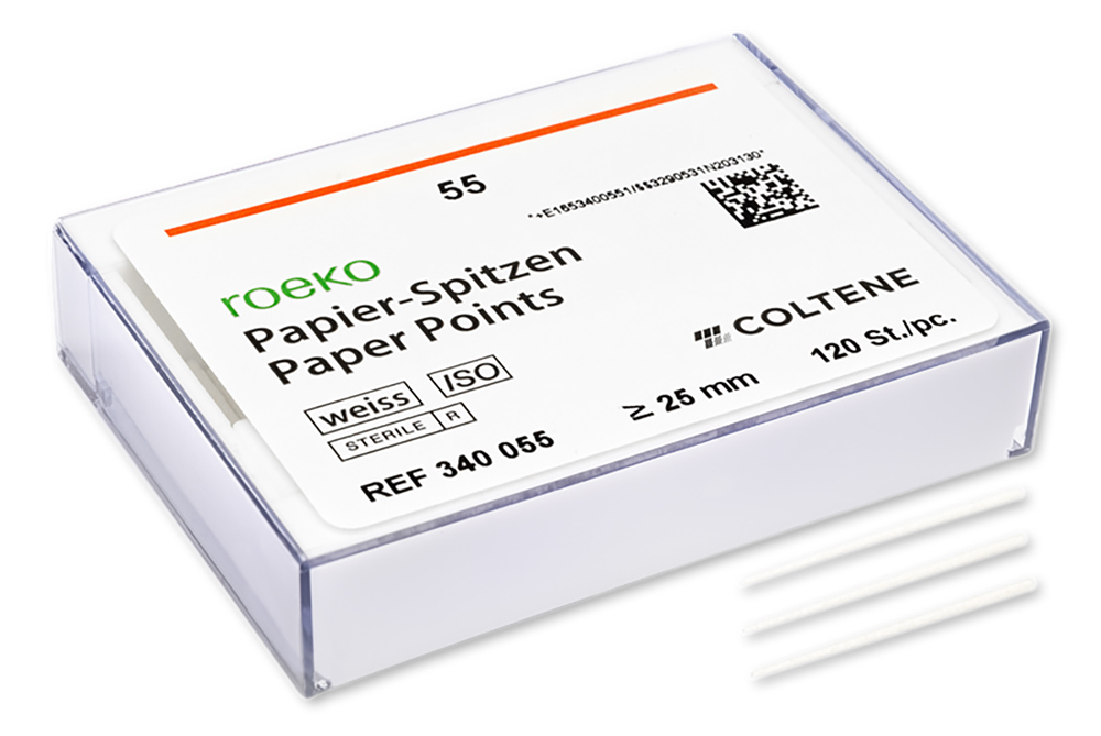 ROEKO white paper points allow cleaning and drying of the root canal to be monitored. The paper points are available assorted or in individual sizes ≥ 25 mm.