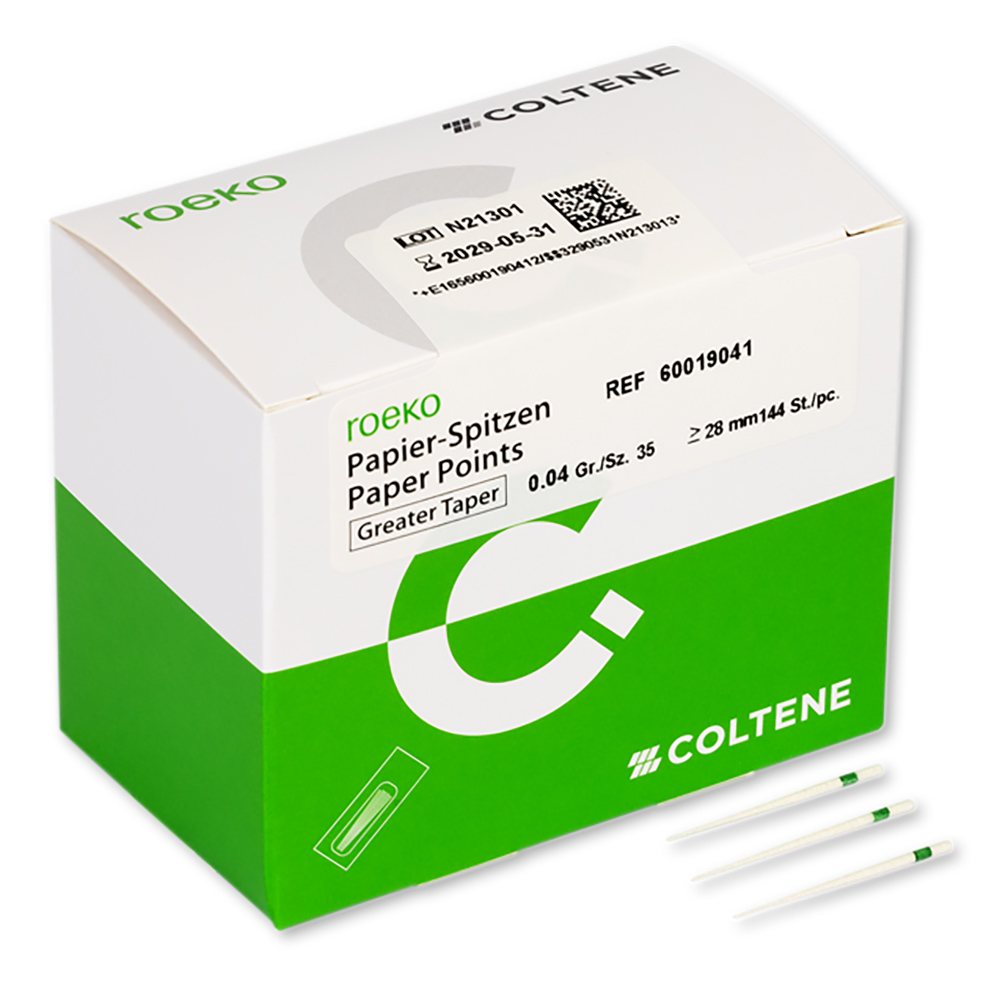 ROEKO Paper Points Greater Taper are ideal for drying root canals which have been prepared with HyFlex CM files, GT Files, HERO, ProFile, Quantec etc. The diameter of the tip corresponds to the ISO sizes. The colour-coding on top of the white tip prevents mixing up of sizes. The paper points are available with a taper of 4% or 6%, assorted or in individual sizes ≥ 28 mm.