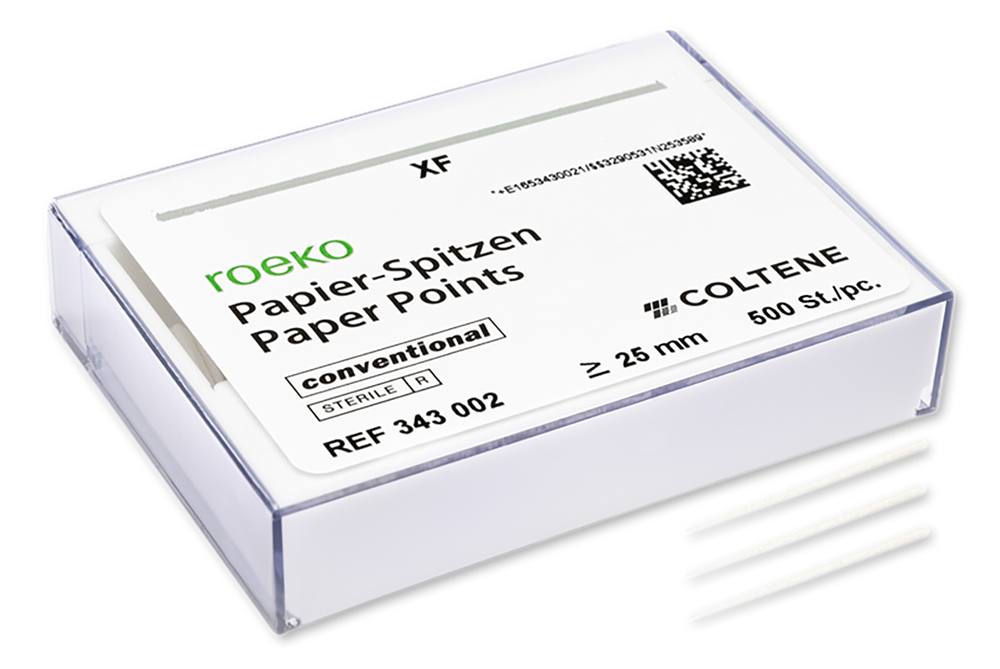 The tapered shape of ROEKO paper points conventional means they are ideal for drying more conical root canals. The white points are more tapered than ISO points and available assorted or in individual sizes ≥ 25 mm.