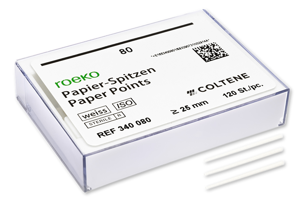 ROEKO white paper points allow cleaning and drying of the root canal to be monitored. The paper points are available assorted or in individual sizes ≥ 25 mm.