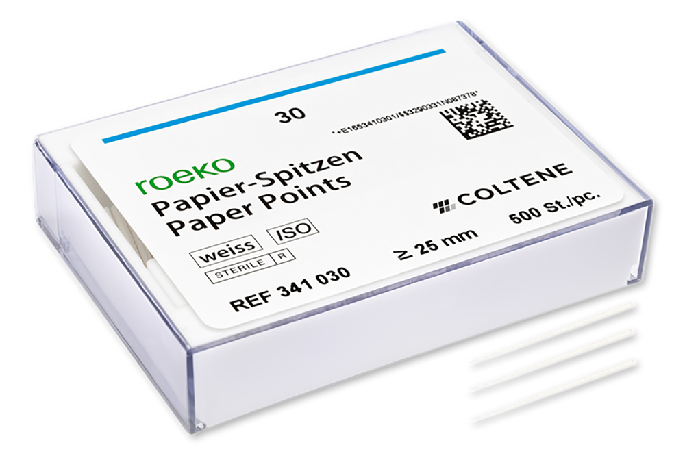 ROEKO white paper points allow cleaning and drying of the root canal to be monitored. The paper points are available assorted or in individual sizes ≥ 25 mm.