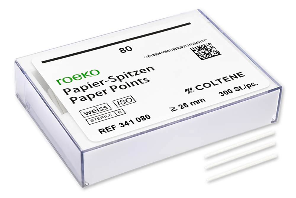 ROEKO white paper points allow cleaning and drying of the root canal to be monitored. The paper points are available assorted or in individual sizes ≥ 25 mm.