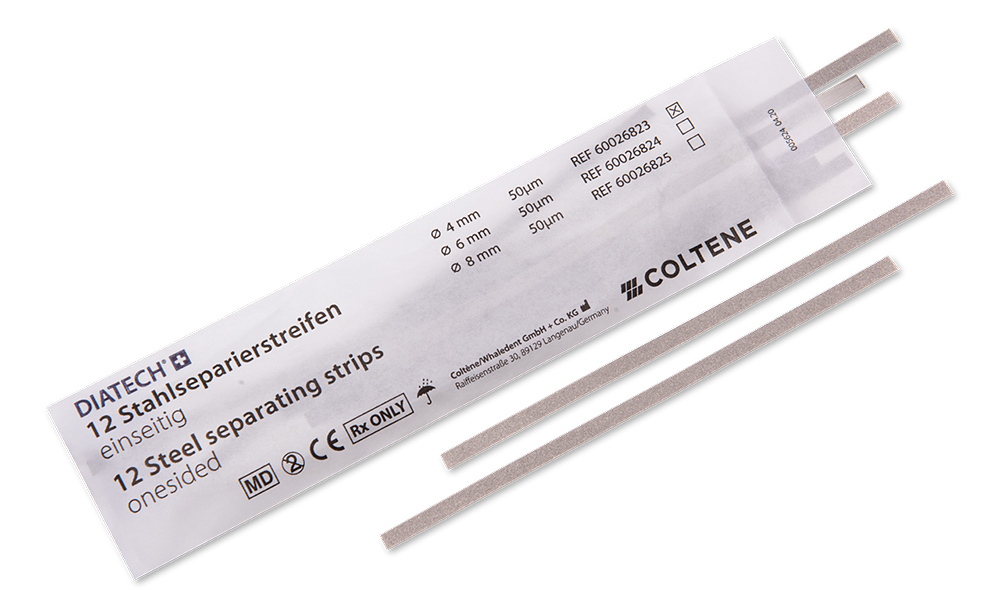 The steel separating strips are suited for manual preparation of the interdental space hardly accessible with other instruments.
