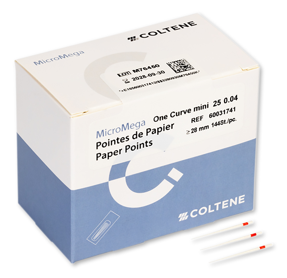 MicroMega One Curve mini paper points are ideal for drying root canals which have been prepared with MicroMega One Curve mini files. At the tip of the point, the diameter corresponds to the ISO sizes, but then the conicity follows that of the One Curve mini files. The points are available in special assortments or as individual sizes ≥ 28 mm.